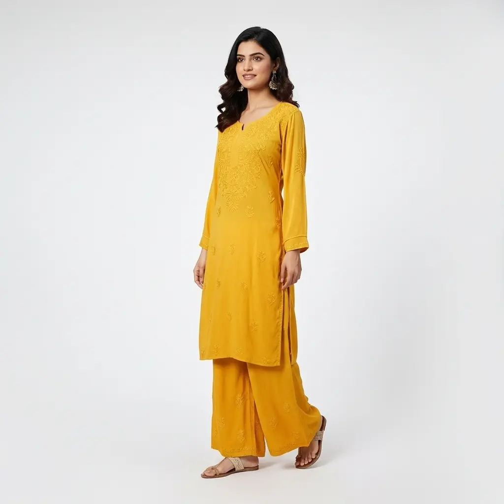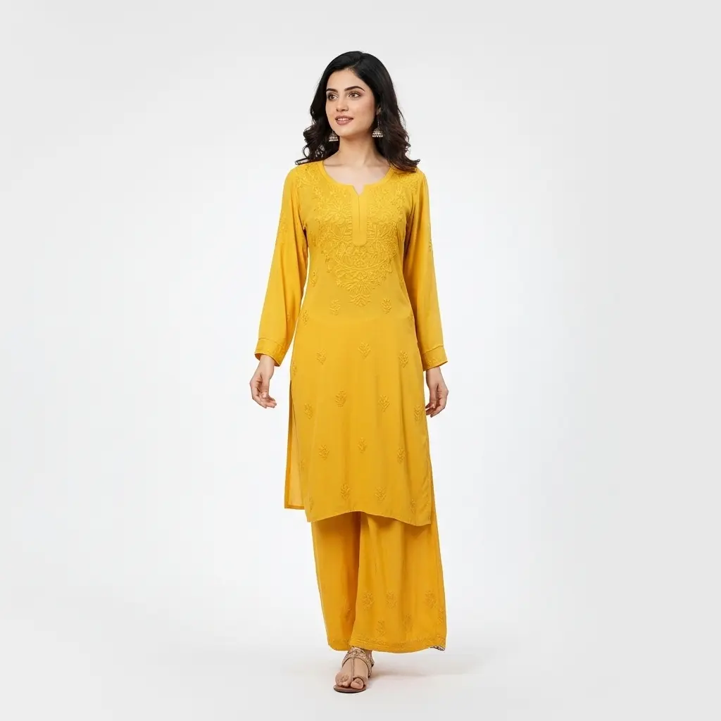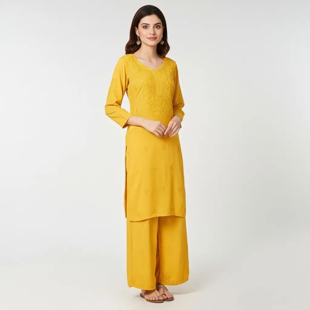 Chikankari Rayon Kurti Set Yellow
