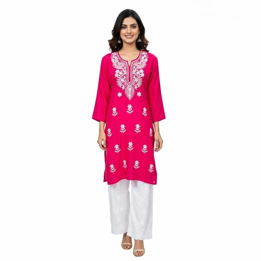 Chikankari Short Kurti Emb Bright Pink
