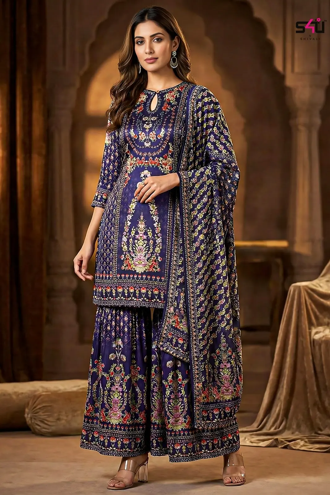 Blue Embroidered Sharara/Plazzo Kurti with Bottom and Dupatta