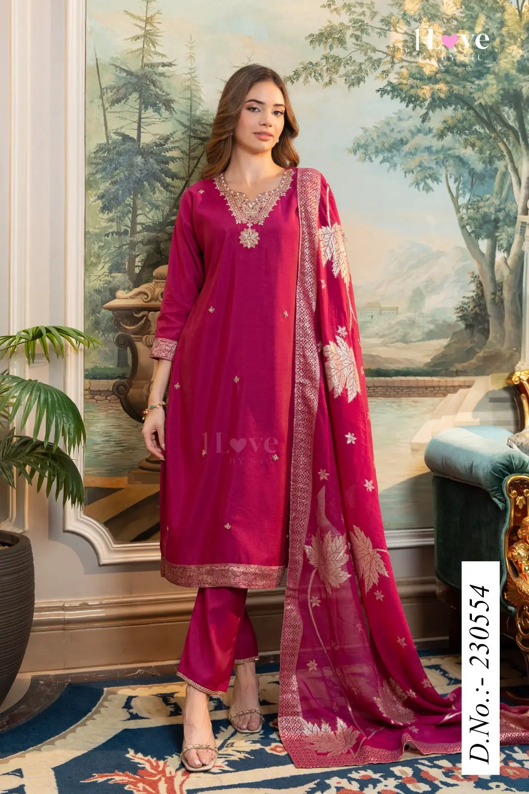 Rani Pink Embroidered Kurti with Bottom and Dupatta